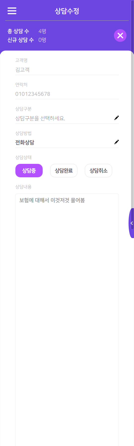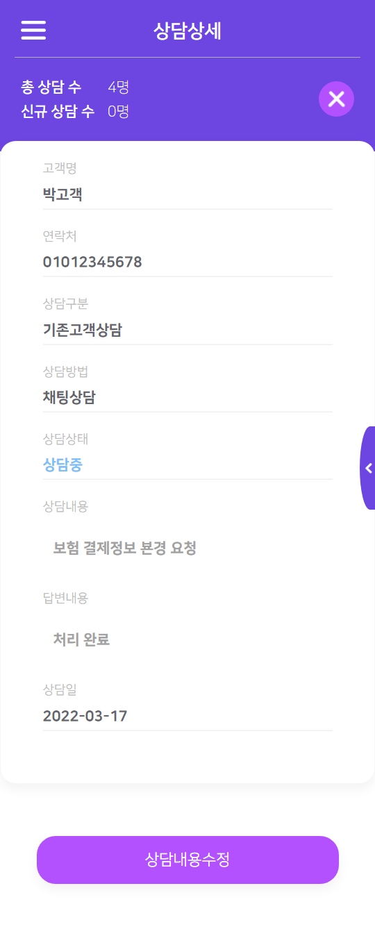 - 상담내용수정를 터치하면 상담내용 수정 페이지로 이동합니다.